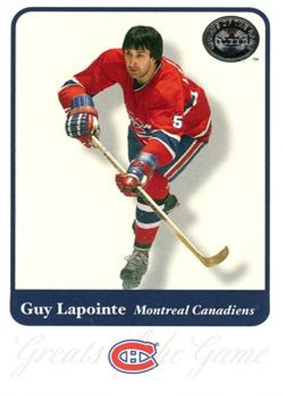 The Guy Lapointe 2001 Fleer Greats of the Game #20 Base card is 1 of 2 Guy Lapointe's card variations in the 2001 Fleer Greats of the Game set being tracked by Sports Card Investor, including Autographs.