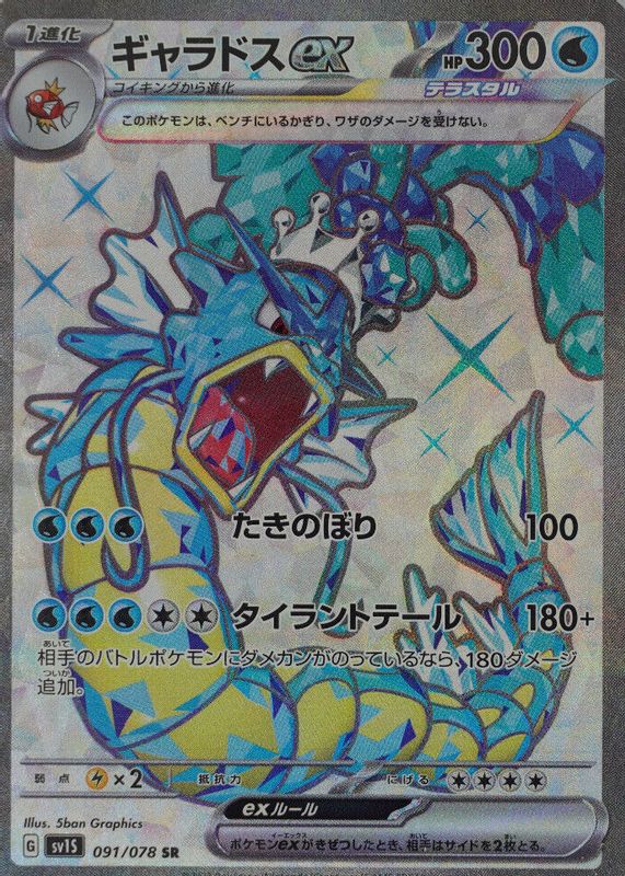 The Gyarados ex 2023 Japanese Scarlet & Violet: Scarlet ex #091/078 Super Rare card in Raw TCG (Near Mint) condition has moved down -$1.58 (-19.4%) in the last 30 days and was last sold for $6.57 .