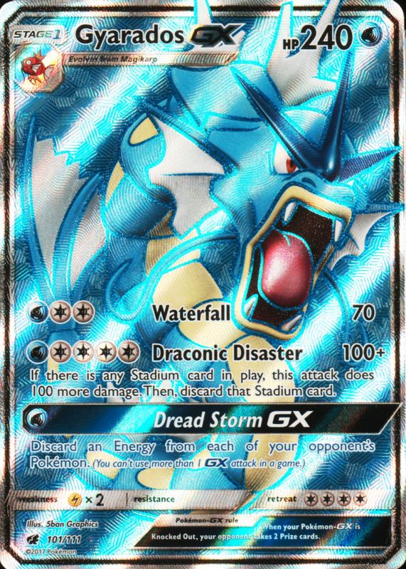 The Gyarados GX 2017 Sun & Moon: Crimson Invasion #101/111 Holo (Full Art) card in Raw TCG (Near Mint) condition has moved up $1.00 (+6.7%) in the last 30 days and was last sold for $16.00 .