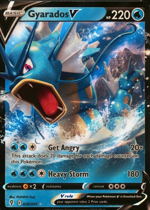 The Gyarados V 2021 Sword & Shield: Evolving Skies #028/203 Holo card in Raw TCG (Near Mint) condition has moved up $0.00 (+0.1%) in the last 30 days and was last sold for $2.69 .