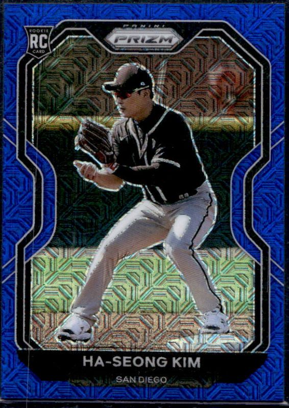The Ha-Seong Kim 2021 Prizm #178 Blue Mojo /199 Rookie card is 1 of 75 Ha-Seong Kim's card variations in the 2021 Prizm set being tracked by Sports Card Investor, including Base, Blue, Blue Velocity, Carolina Blue, and Cosmic Haze.