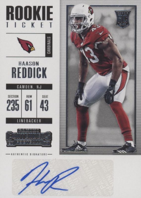 This card is 1 of 11 Haason Reddick's card variations in the 2017 Contenders set being tracked by Sports Card Investor, including Rookie Ticket Auto Variation, Rookie Ticket Auto - Championship Ticket (/25), Rookie Ticket Auto - Playoff Ticket (/49), Rookie Ticket Auto - Red Zone Ticket, and Rookie Ticket Auto Variation - Championship Ticket (/25).