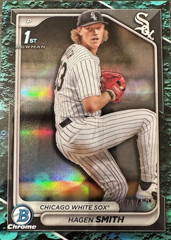 This card is 1 of 50 Hagen Smith's card variations in the 2024 Bowman Draft set being tracked by Sports Card Investor, including Chrome (1st), Chrome - Bubble Gum (1st), Chrome - Lunar Glow Refractor (1st), Chrome - Peanuts (1st), and Chrome - Pearl Refractor (1st).