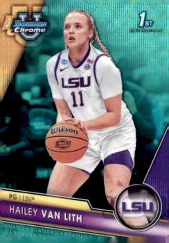 The Hailey Van Lith 2023 Bowman Chrome University #25 Aqua Wave Refractor /299 card is 1 of 52 Hailey Van Lith's card variations in the 2023 Bowman Chrome University set being tracked by Sports Card Investor, including Base, Pink Refractor, Purple Shimmer Refractor, Refractor, and X-Fractor.