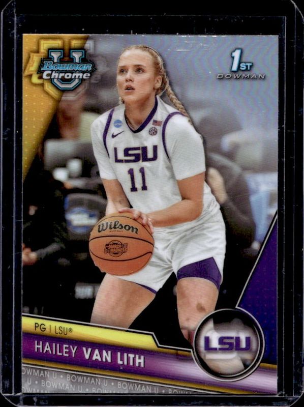 The Hailey Van Lith 2023 Bowman Chrome University #25 Refractor card is 1 of 52 Hailey Van Lith's card variations in the 2023 Bowman Chrome University set being tracked by Sports Card Investor, including Base, Pink Refractor, Purple Shimmer Refractor, X-Fractor, and Purple Mini-Diamond Refractor /399.
