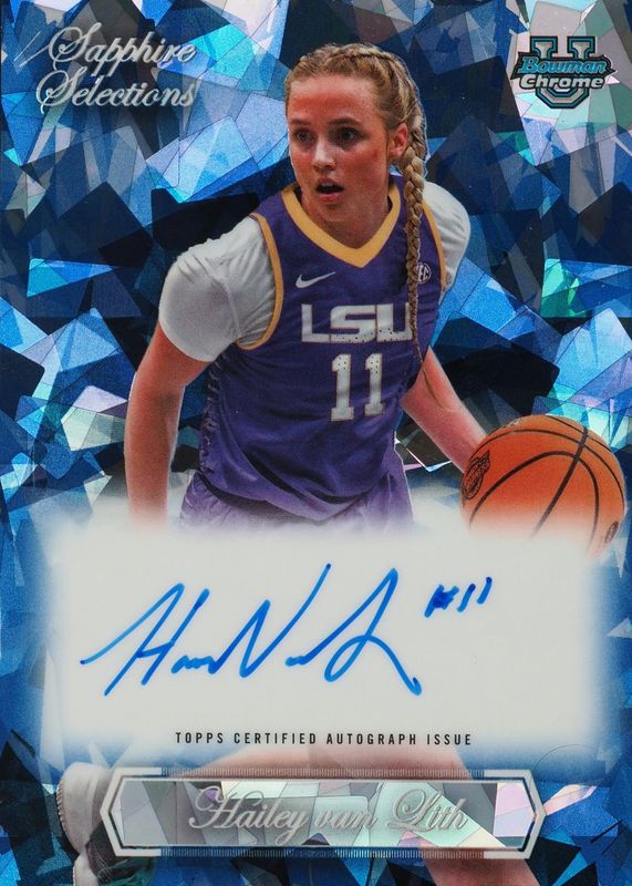 The Hailey Van Lith 2023 Bowman Chrome University Sapphire Edition #SA-HVL Sapphire Selections Autographs /50 card in Raw condition has not changed in price in the last 30 days and was last sold for $117.14 .