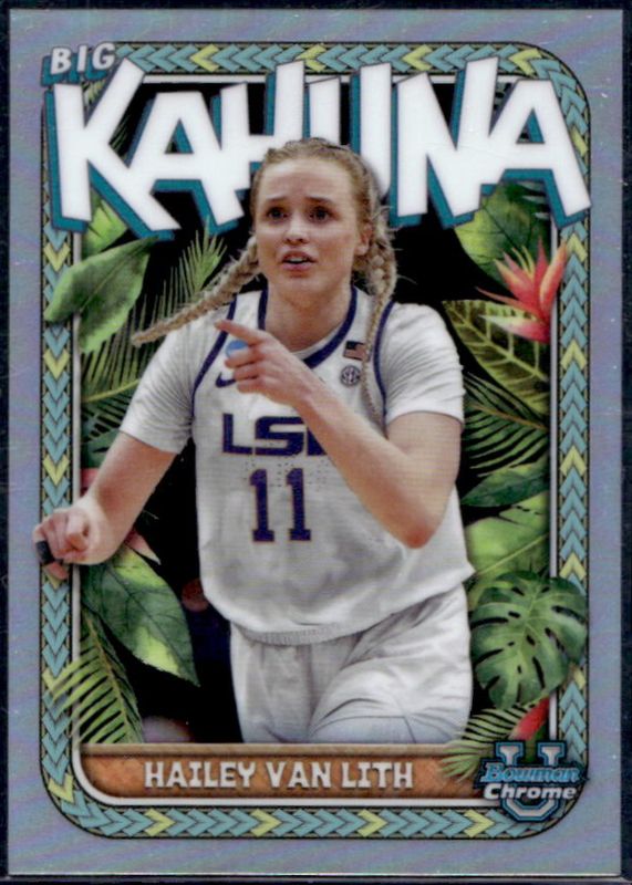 The Hailey Van Lith 2023 Bowman Chrome University #BK-18 The Big Kahuna card is 1 of 52 Hailey Van Lith's card variations in the 2023 Bowman Chrome University set being tracked by Sports Card Investor, including Base, Pink Refractor, Purple Shimmer Refractor, Refractor, and X-Fractor.