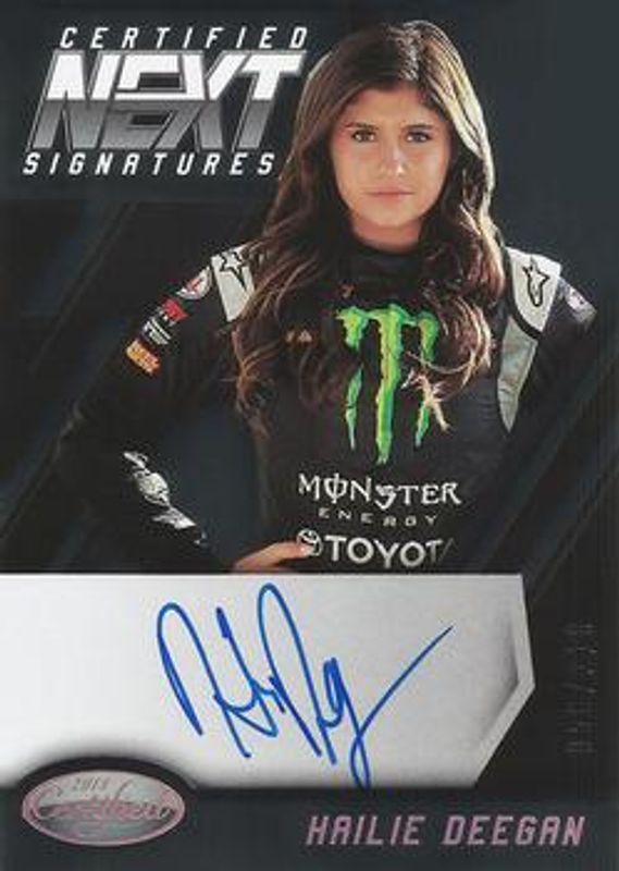 The Hailie Deegan 2018 Certified NASCAR #NEXT-HD Certified Next Signatures /210 Rookie card is 1 of 7 Hailie Deegan's card variations in the 2018 Certified NASCAR set being tracked by Sports Card Investor, including Certified Next Signatures - Red /149, Certified Next Signatures - Blue /50, Certified Next Signatures - Gold /25, Certified Next Signatures - Purple /10, and Certified Next Signatures - Green /5.
