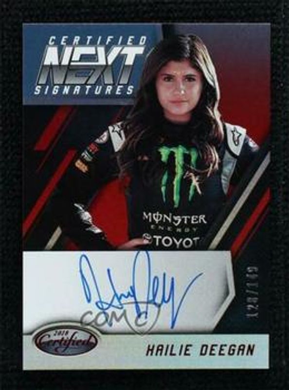 The Hailie Deegan 2018 Certified NASCAR #NEXT-HD Certified Next Signatures - Red /149 Rookie card is 1 of 7 Hailie Deegan's card variations in the 2018 Certified NASCAR set being tracked by Sports Card Investor, including Certified Next Signatures /210, Certified Next Signatures - Blue /50, Certified Next Signatures - Gold /25, Certified Next Signatures - Purple /10, and Certified Next Signatures - Green /5.
