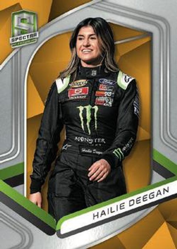The Hailie Deegan 2020 Chronicles NASCAR #82 Spectra Gold /10 card is 1 of 122 Hailie Deegan's card variations in the 2020 Chronicles NASCAR set being tracked by Sports Card Investor, including Base, Blue /199, Red /99, Purple /25, and Gold /10.