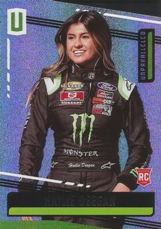 The Hailie Deegan 2020 Chronicles NASCAR #13 Unparalleled card is 1 of 122 Hailie Deegan's card variations in the 2020 Chronicles NASCAR set being tracked by Sports Card Investor, including Base, Blue /199, Red /99, Purple /25, and Gold /10.