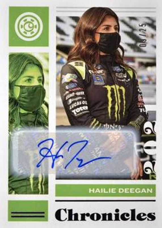 The Hailie Deegan 2021 Chronicles NASCAR #12 Chronicles Autographs - Purple /25 card is 1 of 146 Hailie Deegan's card variations in the 2021 Chronicles NASCAR set being tracked by Sports Card Investor, including Base, Blue /199, Red /99, Purple /25, and Gold /10.