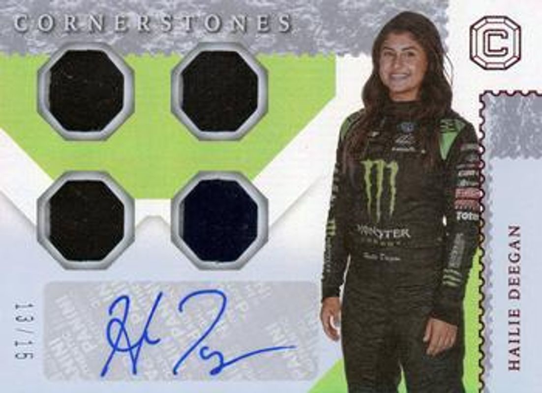 The Hailie Deegan 2021 Chronicles NASCAR #CMS-HD Cornerstones Materials Signatures - Red /25 card is 1 of 146 Hailie Deegan's card variations in the 2021 Chronicles NASCAR set being tracked by Sports Card Investor, including Base, Blue /199, Red /99, Purple /25, and Gold /10.