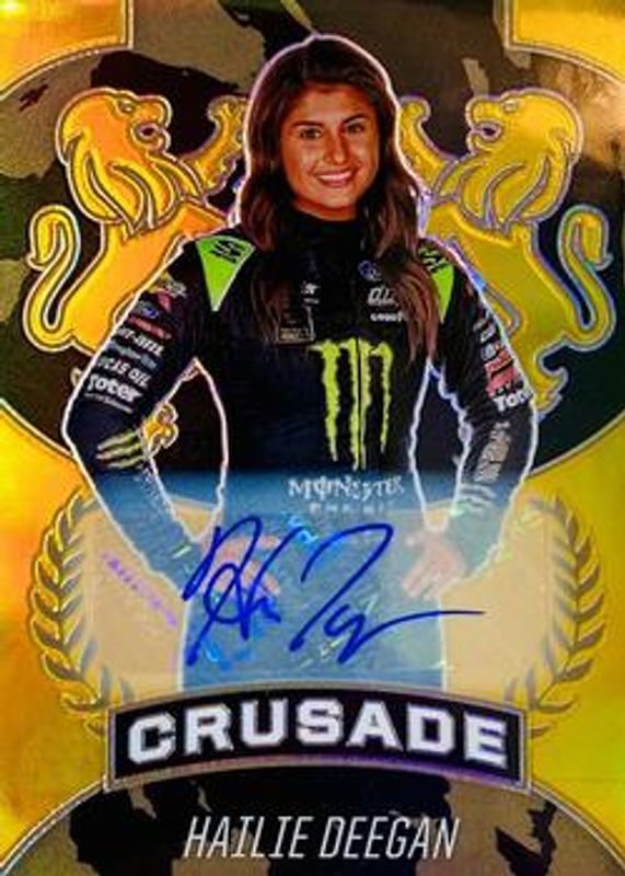 The Hailie Deegan 2021 Chronicles NASCAR #15 Crusade Autographs - Gold /10 card is 1 of 146 Hailie Deegan's card variations in the 2021 Chronicles NASCAR set being tracked by Sports Card Investor, including Base, Blue /199, Red /99, Purple /25, and Gold /10.