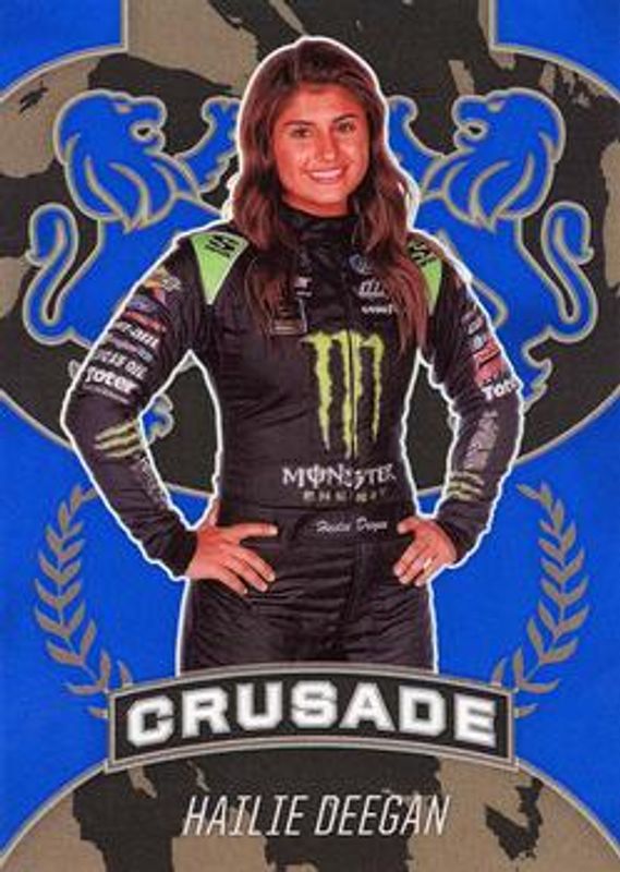 The Hailie Deegan 2021 Chronicles NASCAR #15 Crusade - Blue /199 card is 1 of 146 Hailie Deegan's card variations in the 2021 Chronicles NASCAR set being tracked by Sports Card Investor, including Base, Blue /199, Red /99, Purple /25, and Gold /10.