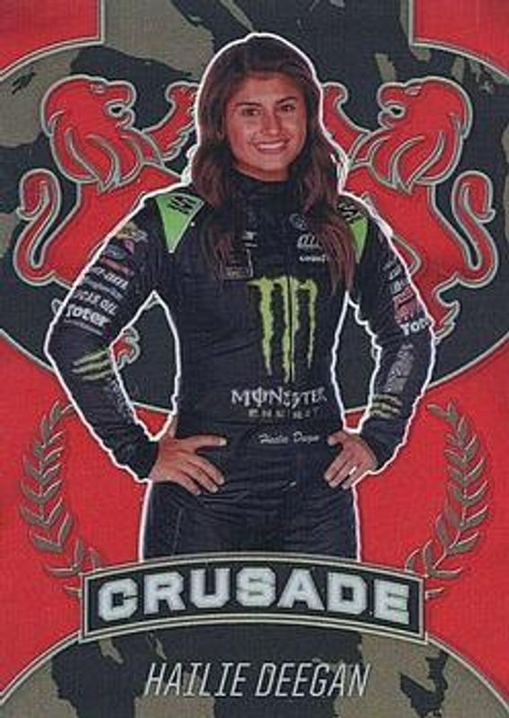 The Hailie Deegan 2021 Chronicles NASCAR #15 Crusade - Red /99 card is 1 of 146 Hailie Deegan's card variations in the 2021 Chronicles NASCAR set being tracked by Sports Card Investor, including Base, Blue /199, Red /99, Purple /25, and Gold /10.