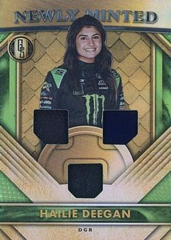The Hailie Deegan 2021 Chronicles NASCAR #GS-HD Gold Standard Newly Minted card is 1 of 146 Hailie Deegan's card variations in the 2021 Chronicles NASCAR set being tracked by Sports Card Investor, including Base, Blue /199, Red /99, Purple /25, and Gold /10.
