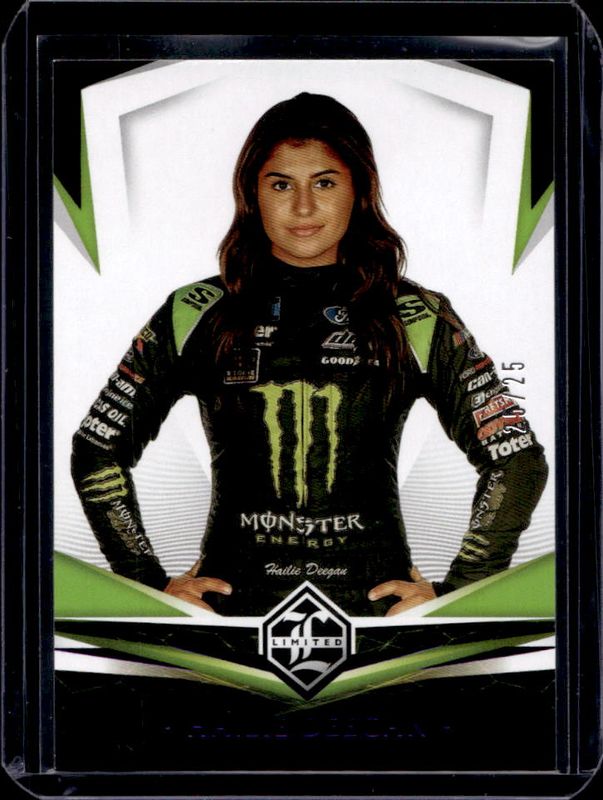 The Hailie Deegan 2021 Chronicles NASCAR #10 Limited - Purple /25 card is 1 of 146 Hailie Deegan's card variations in the 2021 Chronicles NASCAR set being tracked by Sports Card Investor, including Base, Blue /199, Red /99, Purple /25, and Gold /10.