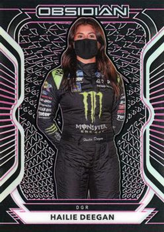 The Hailie Deegan 2021 Chronicles NASCAR #42 Obsidian - Electric Etch Pink /25 card is 1 of 146 Hailie Deegan's card variations in the 2021 Chronicles NASCAR set being tracked by Sports Card Investor, including Base, Blue /199, Red /99, Purple /25, and Gold /10.