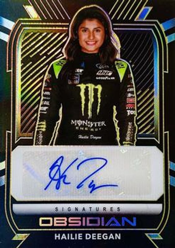 The Hailie Deegan 2021 Chronicles NASCAR #OS-HD Obsidian Signatures - Electric Etch Yellow /10 card is 1 of 146 Hailie Deegan's card variations in the 2021 Chronicles NASCAR set being tracked by Sports Card Investor, including Base, Blue /199, Red /99, Purple /25, and Gold /10.