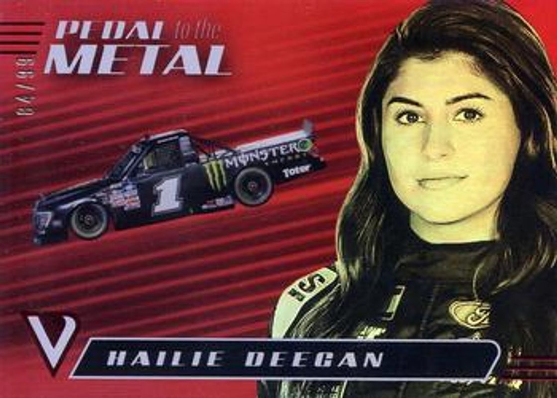 The Hailie Deegan 2021 Chronicles NASCAR #16 Pedal to the Metal - Red /99 card is 1 of 146 Hailie Deegan's card variations in the 2021 Chronicles NASCAR set being tracked by Sports Card Investor, including Base, Blue /199, Red /99, Purple /25, and Gold /10.