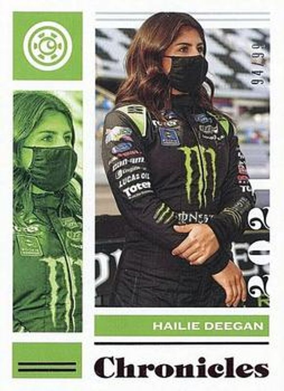 The Hailie Deegan 2021 Chronicles NASCAR #12 Red /99 card is 1 of 146 Hailie Deegan's card variations in the 2021 Chronicles NASCAR set being tracked by Sports Card Investor, including Base, Blue /199, Purple /25, Gold /10, and Black /1.