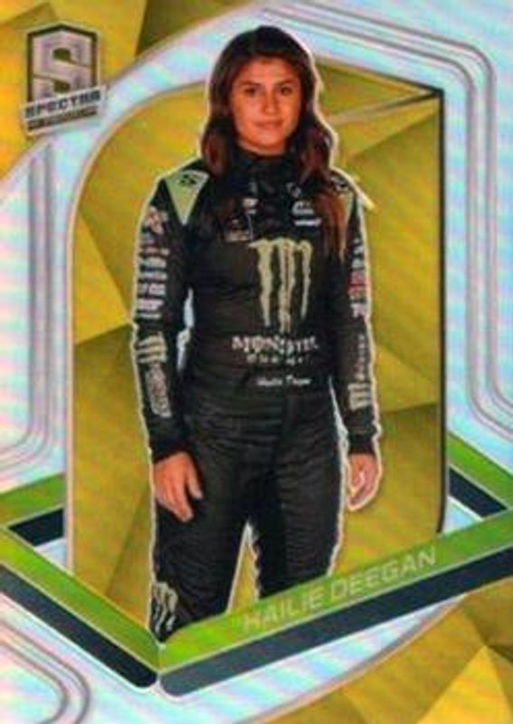 The Hailie Deegan 2021 Chronicles NASCAR #60a Spectra - Gold /10 card is 1 of 146 Hailie Deegan's card variations in the 2021 Chronicles NASCAR set being tracked by Sports Card Investor, including Base, Blue /199, Red /99, Purple /25, and Gold /10.