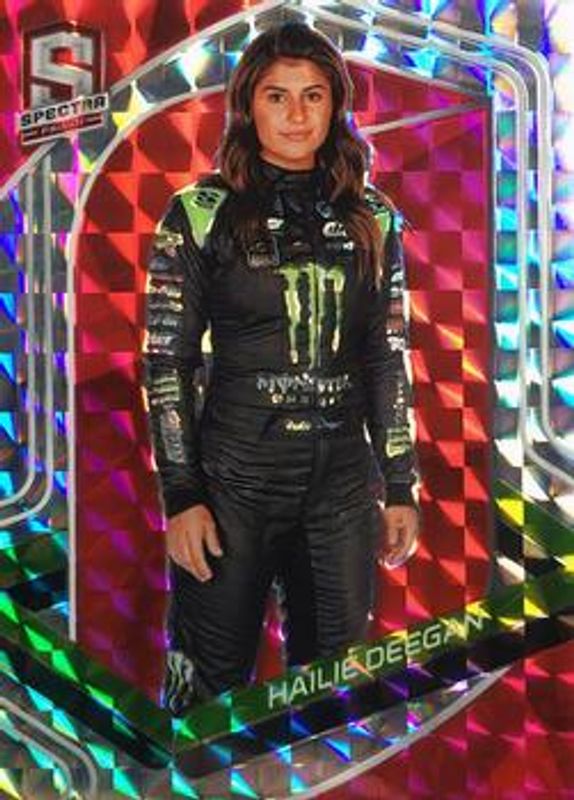 The Hailie Deegan 2021 Chronicles NASCAR #60a Spectra - Interstellar Red /49 card is 1 of 146 Hailie Deegan's card variations in the 2021 Chronicles NASCAR set being tracked by Sports Card Investor, including Base, Blue /199, Red /99, Purple /25, and Gold /10.