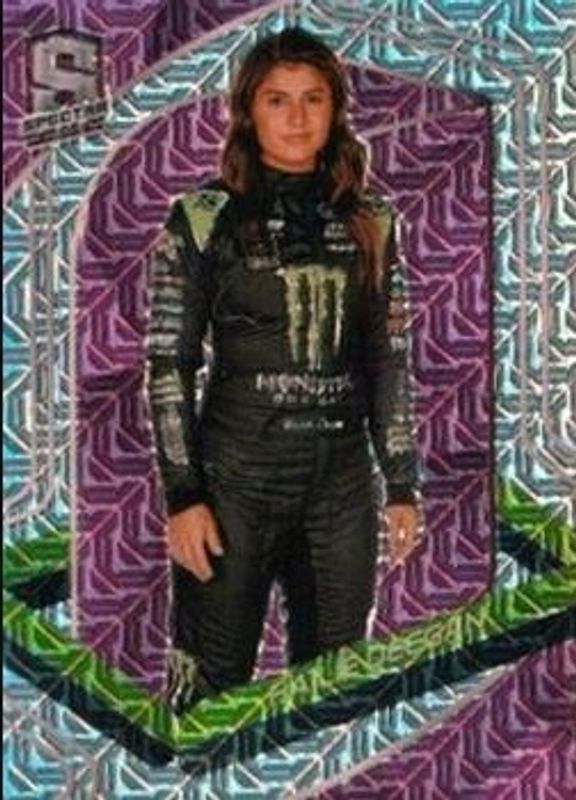 The Hailie Deegan 2021 Chronicles NASCAR #60a Spectra - Meta Pink /25 card is 1 of 146 Hailie Deegan's card variations in the 2021 Chronicles NASCAR set being tracked by Sports Card Investor, including Base, Blue /199, Red /99, Purple /25, and Gold /10.