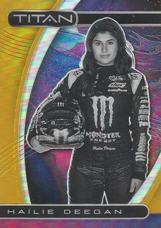 The Hailie Deegan 2021 Chronicles NASCAR #16 Titan - Gold /10 card is 1 of 146 Hailie Deegan's card variations in the 2021 Chronicles NASCAR set being tracked by Sports Card Investor, including Base, Blue /199, Red /99, Purple /25, and Gold /10.