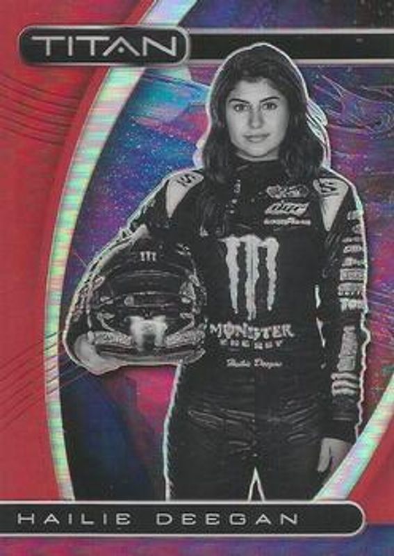 The Hailie Deegan 2021 Chronicles NASCAR #16 Titan - Red /99 card is 1 of 146 Hailie Deegan's card variations in the 2021 Chronicles NASCAR set being tracked by Sports Card Investor, including Base, Blue /199, Red /99, Purple /25, and Gold /10.
