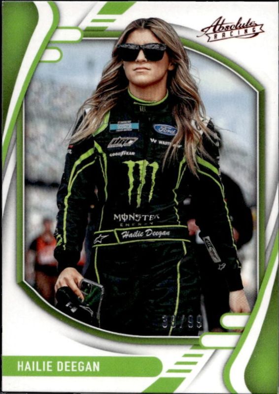 The Hailie Deegan 2022 Chronicles NASCAR #2 Absolute Red /99 card is 1 of 149 Hailie Deegan's card variations in the 2022 Chronicles NASCAR set being tracked by Sports Card Investor, including Absolute, Absolute Autographs, Black, Black Autographs, and Black Green.