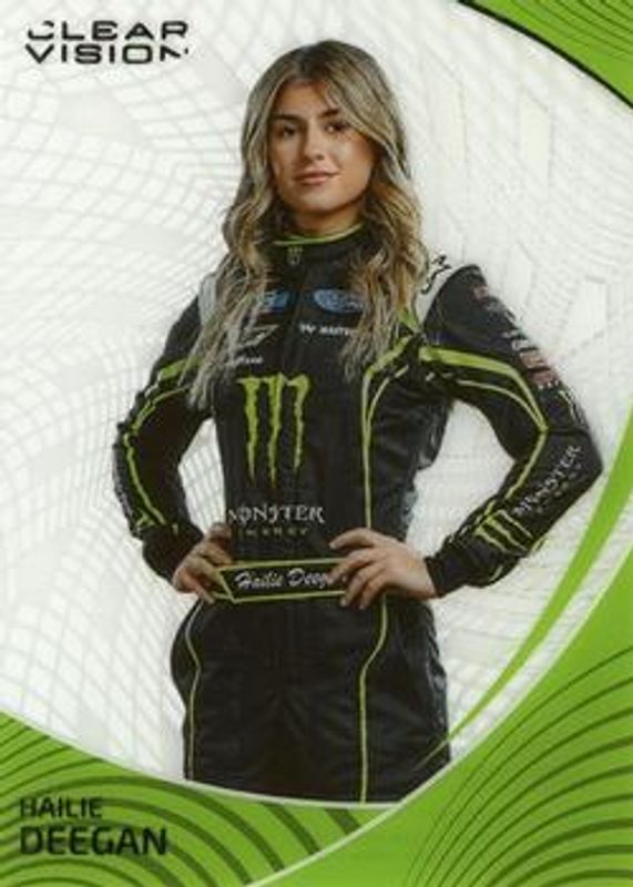 The Hailie Deegan 2022 Chronicles NASCAR #16 Clear Vision card is 1 of 149 Hailie Deegan's card variations in the 2022 Chronicles NASCAR set being tracked by Sports Card Investor, including Absolute, Absolute Autographs, Black, Black Autographs, and Black Green.