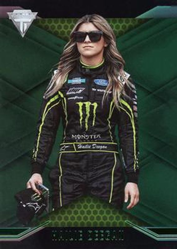 The Hailie Deegan 2022 Chronicles NASCAR #16 Titanium Green card is 1 of 149 Hailie Deegan's card variations in the 2022 Chronicles NASCAR set being tracked by Sports Card Investor, including Absolute, Absolute Autographs, Black, Black Autographs, and Black Green.