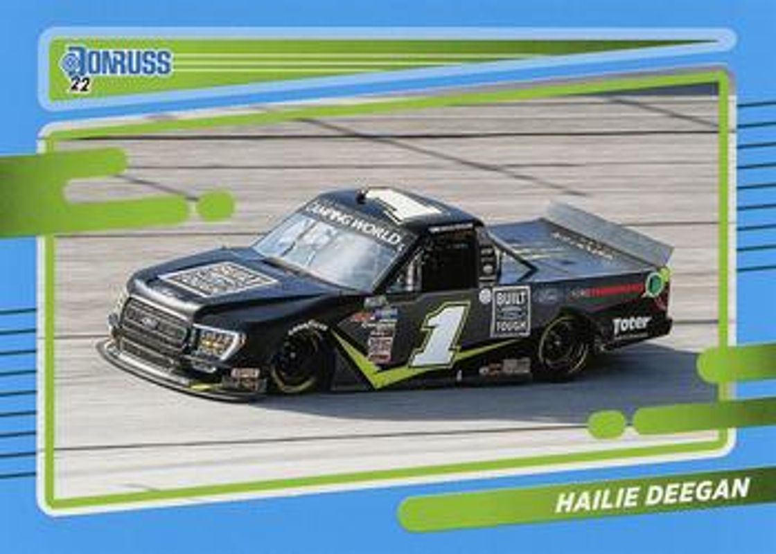 The Hailie Deegan 2022 Donruss NASCAR #45 Carolina Blue card is 1 of 93 Hailie Deegan's card variations in the 2022 Donruss NASCAR set being tracked by Sports Card Investor, including #132 Base, #45 Base, #85 Base, #85 Carolina Blue, and #132 Carolina Blue.