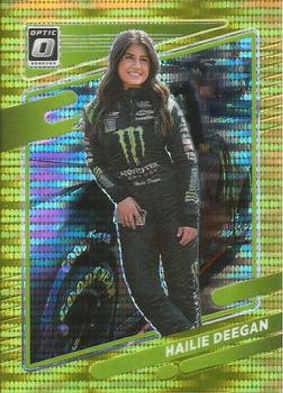 The Hailie Deegan 2022 Donruss NASCAR #38 Optic Gold Pulsar card is 1 of 93 Hailie Deegan's card variations in the 2022 Donruss NASCAR set being tracked by Sports Card Investor, including #132 Base, #45 Base, #85 Base, #85 Carolina Blue, and #132 Carolina Blue.