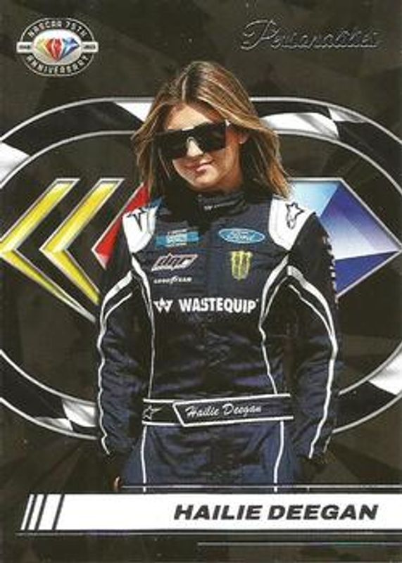 The Hailie Deegan 2023 Donruss NASCAR #3 NASCAR 75th Anniversary card is 1 of 90 Hailie Deegan's card variations in the 2023 Donruss NASCAR set being tracked by Sports Card Investor, including #167 Base, #24 Base, #82 Base, #167 Carolina Blue, and #82 Carolina Blue.