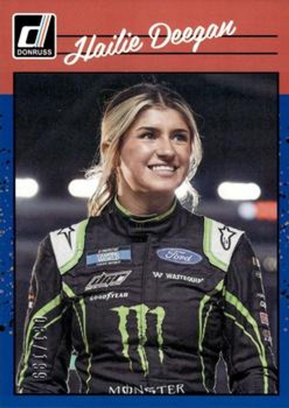 The Hailie Deegan 2023 Donruss NASCAR #167 Navy Blue /199 card is 1 of 90 Hailie Deegan's card variations in the 2023 Donruss NASCAR set being tracked by Sports Card Investor, including #167 Base, #24 Base, #82 Base, #167 Carolina Blue, and #82 Carolina Blue.