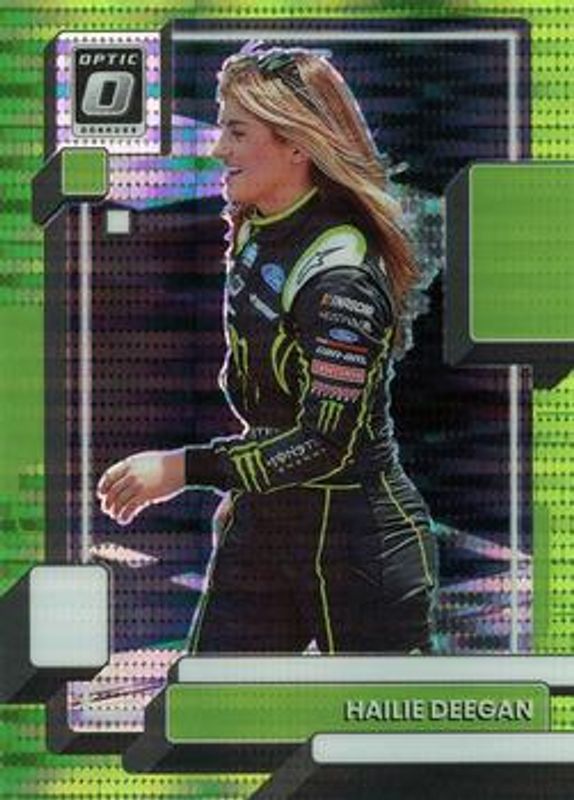 The Hailie Deegan 2023 Donruss NASCAR #30 Optic Lime Green Pulsar card is 1 of 90 Hailie Deegan's card variations in the 2023 Donruss NASCAR set being tracked by Sports Card Investor, including #167 Base, #24 Base, #82 Base, #167 Carolina Blue, and #82 Carolina Blue.