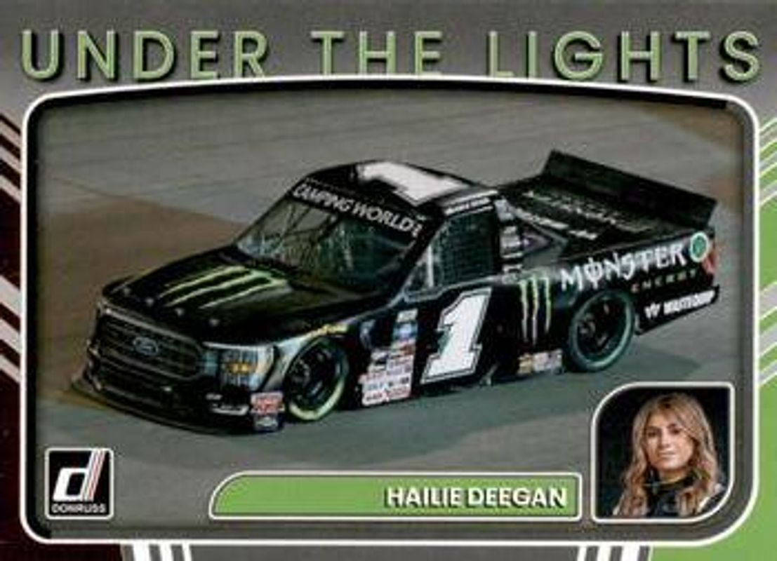 The Hailie Deegan 2023 Donruss NASCAR #UL18 Under The Lights Retail card is 1 of 90 Hailie Deegan's card variations in the 2023 Donruss NASCAR set being tracked by Sports Card Investor, including #167 Base, #24 Base, #82 Base, #167 Carolina Blue, and #82 Carolina Blue.