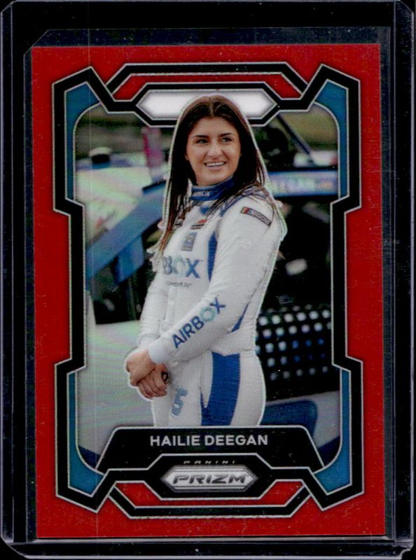The Hailie Deegan 2024 Prizm NASCAR #16 Rides - Red /299 card is 1 of 81 Hailie Deegan's card variations in the 2024 Prizm NASCAR set being tracked by Sports Card Investor, including Base, Blue Ice, Green, Green Ice, and Red Ice.