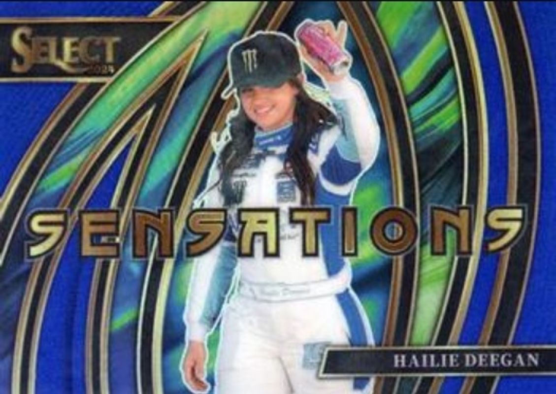 The Hailie Deegan 2024 Select NASCAR #9 Sensations Blue /49 card is 1 of 69 Hailie Deegan's card variations in the 2024 Select NASCAR set being tracked by Sports Card Investor, including #86 Base, #186 Base, #286 Base, #186 Base Orange Flash, and #286 Base Orange Flash.
