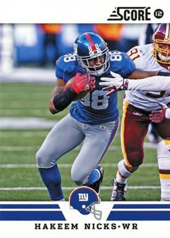 The Hakeem Nicks 2012 Score #35 Glossy card is 1 of 11 Hakeem Nicks' card variations in the 2012 Score set being tracked by Sports Card Investor, including Base, Gold Zone, Scorecard, Artist's Proof /32, and Red Zone /20.