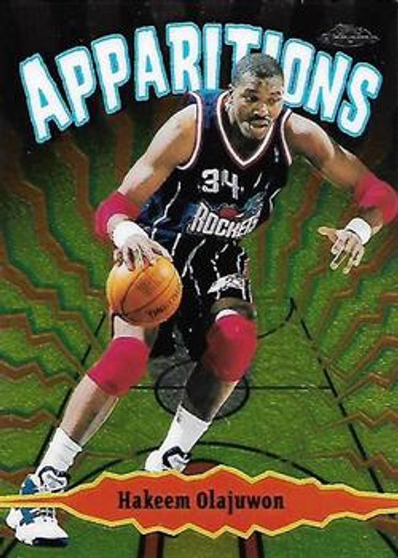The Hakeem Olajuwon 1998 Topps Chrome #A8 Apparitions card is 1 of 9 Hakeem Olajuwon's card variations in the 1998 Topps Chrome set being tracked by Sports Card Investor, including Base, Refractor, Back 2 Back, Instant Impact, and Instant Impact - Refractor.