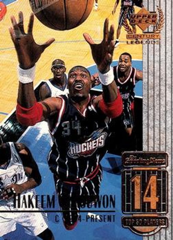 The Hakeem Olajuwon 1998 Upper Deck Century Legends #14 Base card is 1 of 5 Hakeem Olajuwon's card variations in the 1998 Upper Deck Century Legends set being tracked by Sports Card Investor, including Century Collection /100, All Century Team, Epic Milestones, and Epic Signatures.