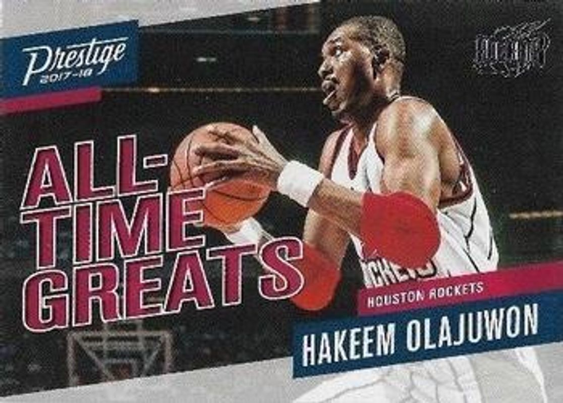 The Hakeem Olajuwon 2017 Prestige #12 All Time Greats card is 1 of 7 Hakeem Olajuwon's card variations in the 2017 Prestige set being tracked by Sports Card Investor, including All Time Greats - Crystal, All Time Greats - Horizon, All Time Greats - Mist, All Time Greats - Rain, and All Time Greats - Crystal Gold /10.