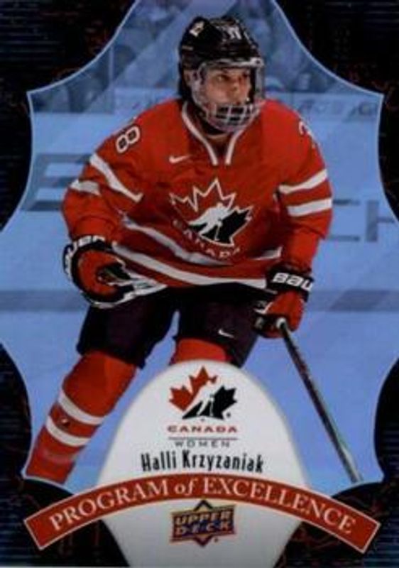 The Halli Krzyzaniak 2016 Upper Deck Team Canada Juniors #POE-45 Program of Excellence card is 1 of 14 Halli Krzyzaniak's card variations in the 2016 Upper Deck Team Canada Juniors set being tracked by Sports Card Investor, including #145 Base, #9 Base, #9 Exclusives /175, #9 High Gloss Spectrum /25, and #145 Gold /16.