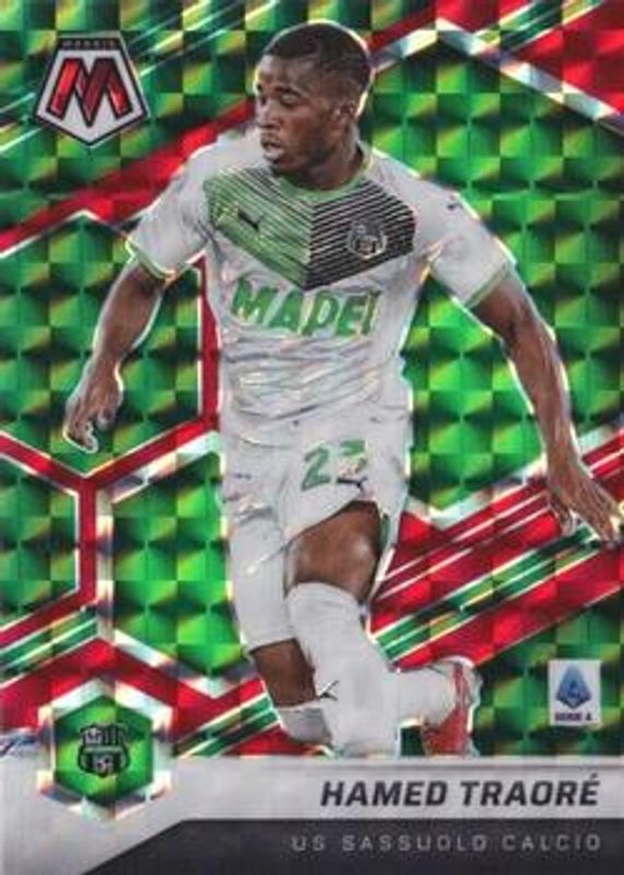 The Hamed Traore 2021 Mosaic Serie A #108 Choice Red & Green card is 1 of 14 Hamed Traore's card variations in the 2021 Mosaic Serie A set being tracked by Sports Card Investor, including Base, Choice Peacock, Red, Silver, and Blue /99.