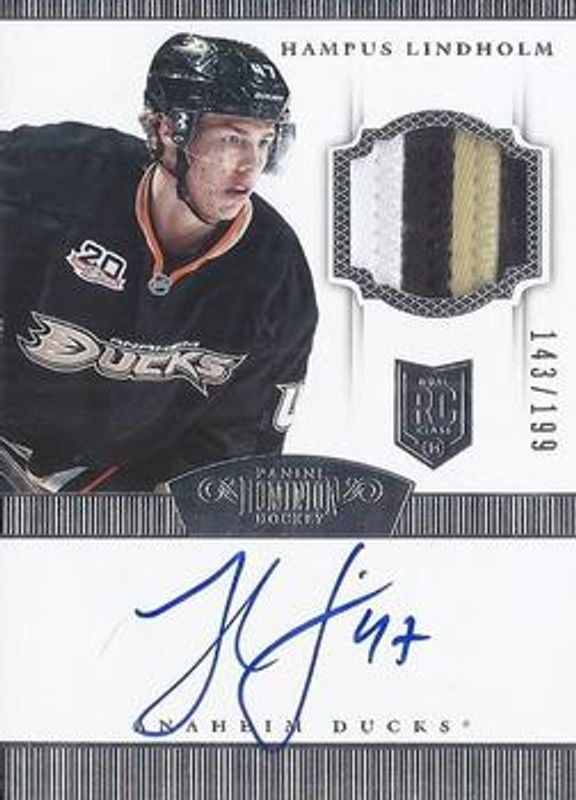 The Hampus Lindholm 2013 Panini Rookie Anthology #185 2013 Panini Dominion Update: Rookie Patch Autographs /299 card is 1 of 44 Hampus Lindholm's card variations in the 2013 Panini Rookie Anthology set being tracked by Sports Card Investor, including Purple /1, 2013 Panini Update, 2013 Panini Update:, 2013 Panini Update: Rookie Autographs, and 2013 Panini Update: Rookie Autographs Spring Expo Cracked Ice - Black.
