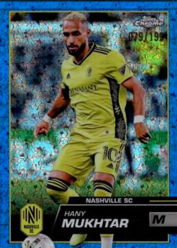 The Hany Mukhtar 2023 Topps Chrome MLS #42 Blue Mini-Diamond Refractor /199 card is 1 of 28 Hany Mukhtar's card variations in the 2023 Topps Chrome MLS set being tracked by Sports Card Investor, including #42 Base, #42b Base, #42 Pink X-Fractor, #42 Refractor, and #42 Speckle Refractor.
